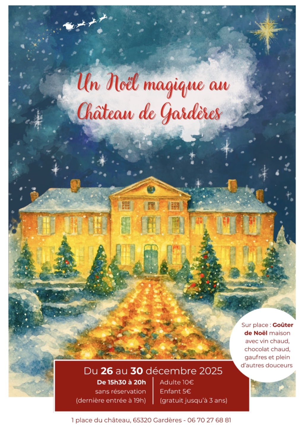 flanerie dans les jardins, visite du château illuminé pour un « Noël magique », goûter de Noël (gaufres, vin chaud, chocolat chaud….).